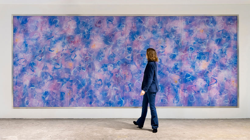 Whispers at Dusk spans eight non-reflective glass panels that are printed with multiple layers of digital UV print combined with glass etching done by hand to reflect the brushstrokes and textures of the original painting. Whispers at Dusk seeks to capture the evanescent quality of grey, purple, and pink forms that appear like mysterious drawings in the sky at twilight.