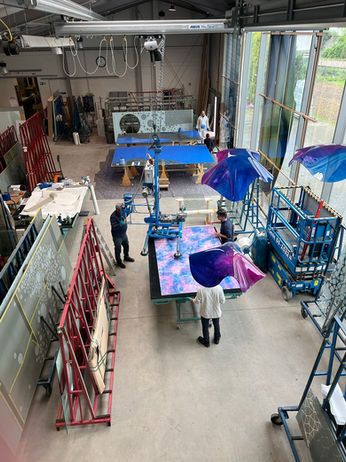 Whispers at Dusk is a forty foot long glass mural, installed in two parts, framing the lower entrance of NYU Langone’s new hospital complex in Garden City, NY. The mural was commissioned by the NYU Langone Art Program and Collection and fabricated in collaboration with Glasmalerie Peters Studios in Germany.